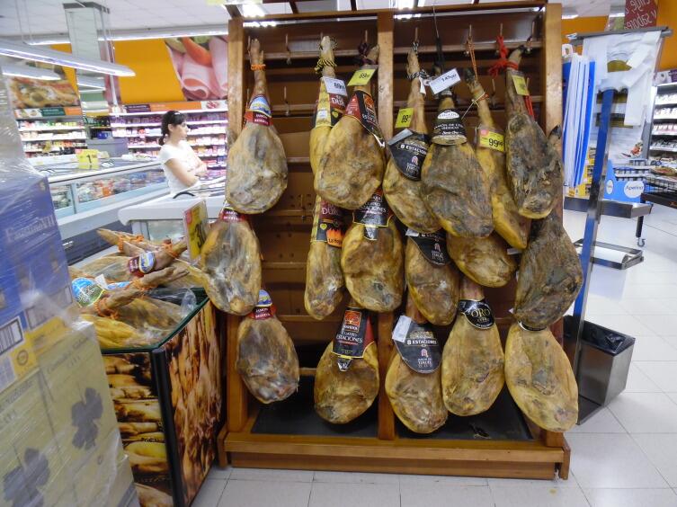 Эти огромные окорока висят во всех магазинах, там же хамон могут порезать на тончайшие, просто прозрачные ломтики. Эти ломтики и будут закуской: в них не вгрызаются остервенело, они сами тают во рту — вне всякого хлеба, бутербродов делать не принято. Хотя и одним хамоном сыт будешь.