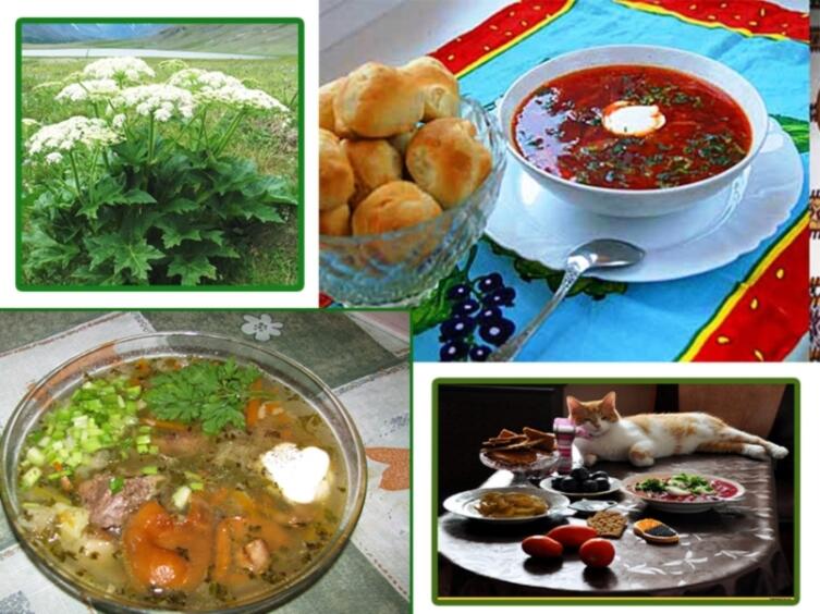На коллаже перед текстом, фото борщевика занимает левый верхний угол. Листья, стебли и побеги многих видов борщевика съедобны в сыром и соленом виде. Из молодой зелени борщевика сибирского варилась похлёбка с овощами и называли её борщом (ст. слав. бърщ). Бытовала даже поговорка: «Был бы борщевик и сныть, и без хлеба сыты будем». Со временем борщевик заменили свеклой так же, как в русских щах репу и брюкву заменили картошкой, при появлении её в России.