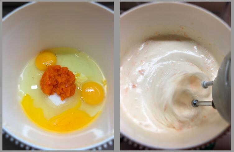 Первым делом в чашу для сбивания отправились яйца, сахар, морковное пюре плюс немного соли и ванильный сахар.