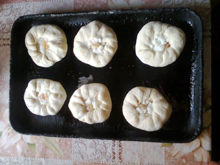 Начнем с ватрушек. От теста отщипываем несколько кусочков, у меня на маленьком противне только шесть штук умещается. Каждую заготовку раскатываем, в середину кладем начинку и аккуратно заворачиваем внутрь к центру. Готово?