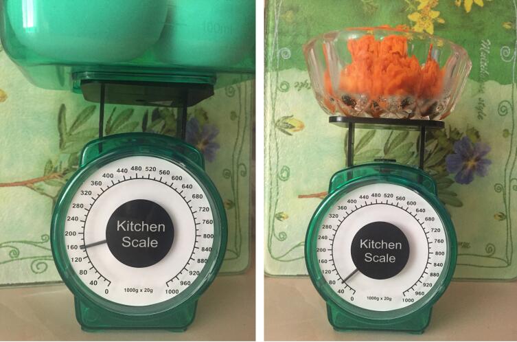 В эксперименте взял в качестве жидких ингредиентов два куриных яйца общим весом 160 г и 60 г тыквенного пюре, которое приготовил в СВЧ-печке и которое по цвету ничем не отличается от морковного.