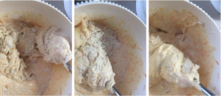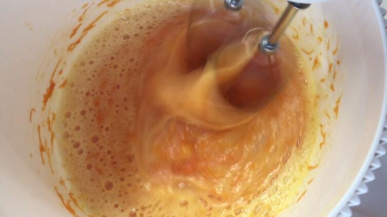 В отличие от «свекольного варианта» проблем со сбиванием не возникло. Как и с морковным пюре, смесь взбилась в высокую плотную пену, которая до начала перемешивания уверенно держала на поверхности высыпанную муку. Затем последовало аккуратное перемешивание муки со взбитой смесью