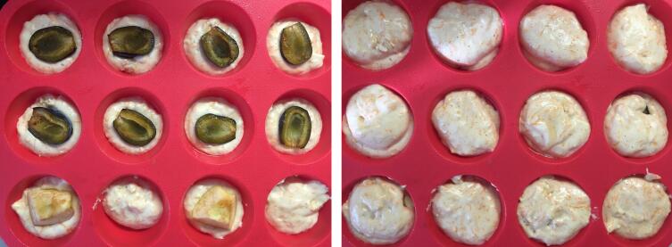 Так же, как и в «свекольном варианте», я решил выпечь бисквит в 12 силиконовых формочках размером 6×2 см, но в качестве основной начинки бисквита использовать сливу. При этом возникло сомнение: а не влияет ли наличие начинки на степень поднятия теста в процессе выпечки. Поэтому для сравнения — в качестве контрольных образцов — в пару формочек положил дольки яблок, а одну пару оставил без начинки.