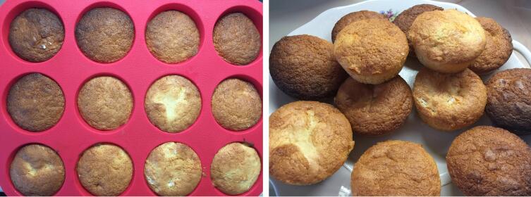 Контрольные образцы с дольками яблок и без начинки (на левом фото они в нижнем ряду, на правом фото — в середине блюда друг на друге) внешне ничем не отличаются от мини-шарлоток со сливами.