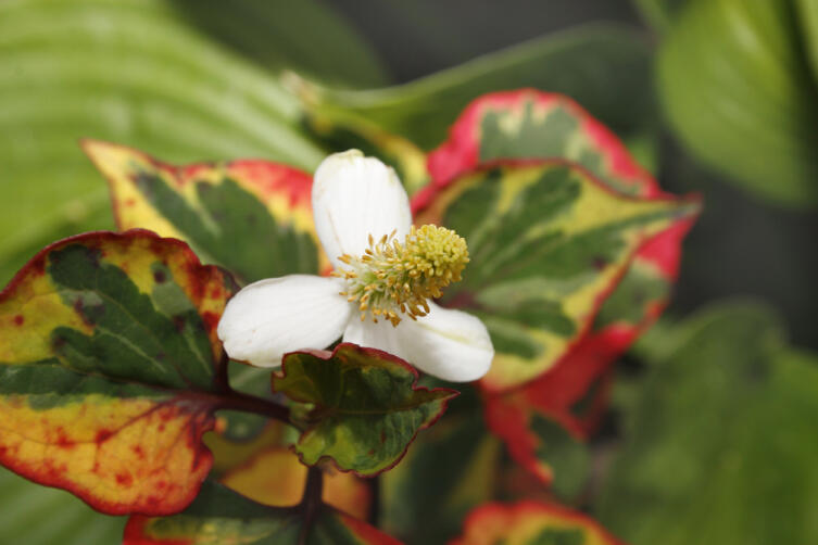 На фоне разноцветной листвы оригинально смотрится колосовидное соцветие (как маленький кукурузный початок), длина которого всего 1−3 см. У основания расположены четыре крупных белых лепестковидных прицветника, украшающих соцветие. Цветение необильное, но продолжительное.