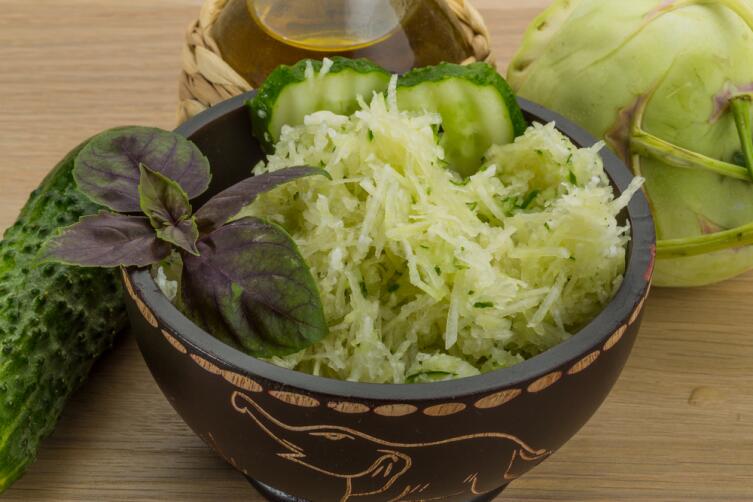 Для приготовления самого простого салата из кольраби стеблеплод очищают от кожуры и трут на крупной тёрке, затем добавляют сметану или растительное масло и немного соли. Хороша кольраби и в овощных супах, и тушеная с другими овощами.