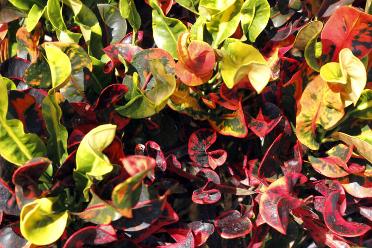 7. Кротон. Меняет цвет в зависимости от освещения. Чем больше света, тем ярче листья. Зимой предательски зеленеет, по весне прожилки расцветают красным-желтым-оранжевым. Спустя три года после покупки мой кротон вдруг словил от чего-то кайф и, ни с того ни с сего, расцвел. Хотя к тому не было никаких предпосылок. Цветочки жиденькие, но смешные — стреляются семенами (или что там внутри этих пупырок), роняют пыльцу. Тоже неравнодушен в водным процедурам. С возрастом теряет нижние листья, что выглядит достаточно неэстетично.