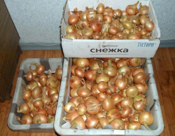 Лук в коробки насыпаю слоем не толще сантиметров пятнадцати, т. е головки располагаются в два-три уровня. В отдельную коробку откладываю головки похуже — слишком мелкие, неправильной формы, немного поврежденные