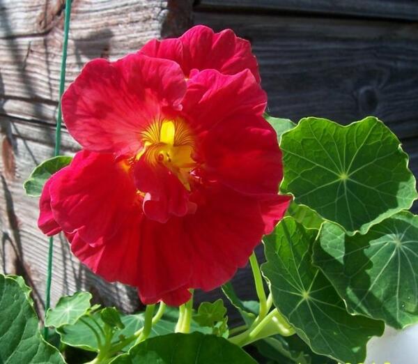 Я хочу познакомить вас лишь с одним видом настурций, который лучше всего подходит для выращивания в цветниках — Настурциeй большой — Tropaeolum majus. Это растение плетистой, со стеблями до 3 метров, или кустовой формы высотой 25−40 см. Стебли разветвленные, голые, сочные. У настурции большой очень красивые округлые с восковым налетом листья, у сортов со светло-окрашенными цветами — светло-зеленые, с красными — ярко-зеленые, с темно-красными пурпурно-темно-зеленые. Цветки крупные, диаметром до 5 см, ароматные, расположены по одному в пазухах листьев, простые или махровые, кремовой, пурпурной, лососевой, оранжевой, красной, темно-вишневой, желтой, розовой окраски. Плод — сборный, распадающийся на три одинаково округлой формы морщинистых плодика.