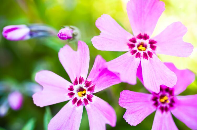 В мае зацветают флоксы шиловидный и растопыренный. В июне вспыхивают алыми цветками флоксы Друммонда, цветущие до самой осени. А если регулярно удалять у них увядшие цветки, то активно появляются боковые побеги и цветение становится ещё пышнее. С середины лета и до самой осени цветут флоксы метельчатый и пятнистый. Именно на основе флокса метельчатого и созданы многочисленные прекрасные садовые сорта флоксов.