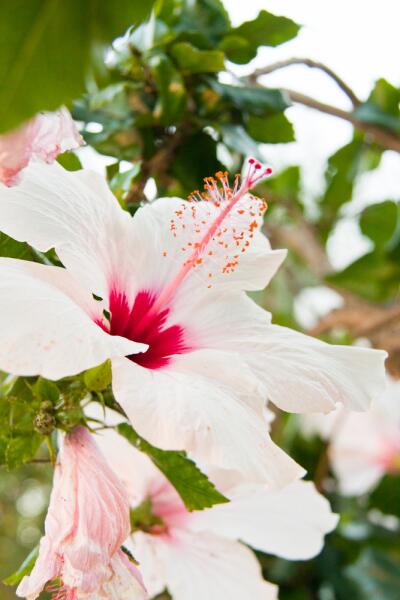 Прошло три-четыре дня, и гибискус начал один за другим раскрывать свои цветки. Они оказались достаточно крупными, около 7 см в диаметре, нежно-белые с вишнёвой серединкой, которая эффектно оттеняла основной цвет лепестков.