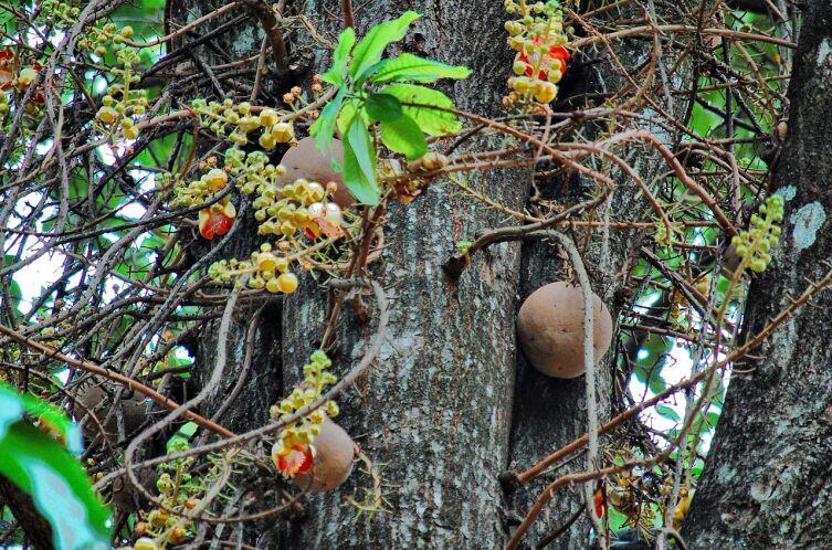 Ещё более экстравагантным становится дерево, когда на нём появляются плоды: крупные, диаметром до 20 см, коричневые, схожие с ядрами старинных пушек. Они свисают с деревьев и при дуновении ветра стучат друг о друга, создавая грохот, напоминающий канонаду.