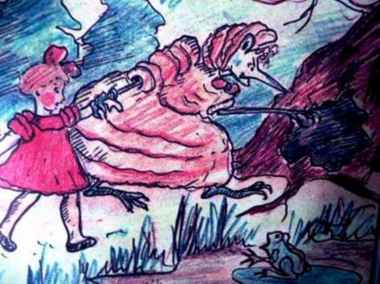 Сюжет сказки родился у нас в семье: моя двоюродная сестра (на десять лет меня младше) Вероника очень хотела иметь длинные волосы, чтобы заплетать их в косу, и попала в лапы Крысухи, которая пообещала ей исполнить её желание, но не просто так, а за службу. Сказка состояла из великолепных рисунков и подстрочника с текстом. Рисунок, где Крысуха ведёт девочку в своё жилище в дупле старого дуба, я привожу в тексте.