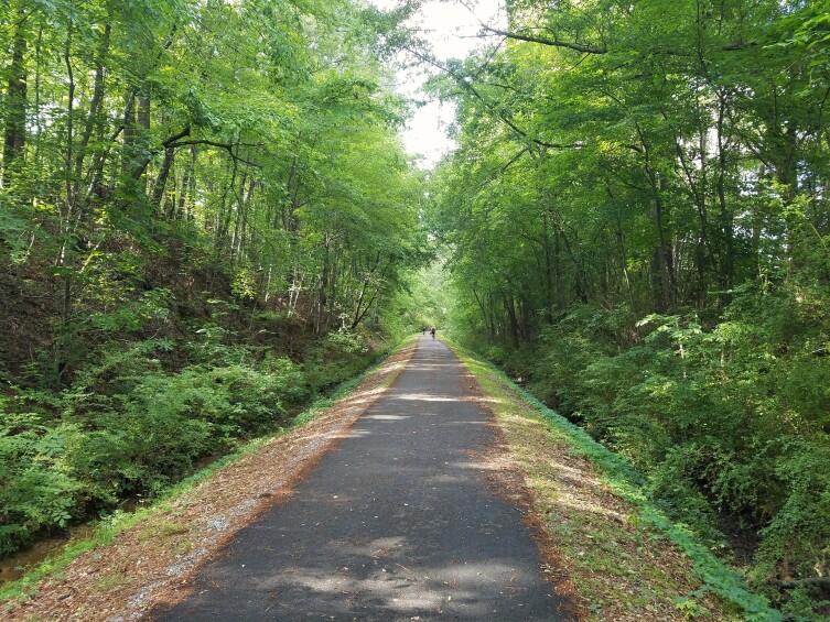 Удивила главная фишка велоцентра — это велодорожка, проложенная по б/у железнодорожного пути по невысокой насыпи, примерно на ширину шпал. Нет никаких тебе крутых поворотов и подъёмов, организатор поездки сказал, что по этой велодорожке можно доехать до Атланты.