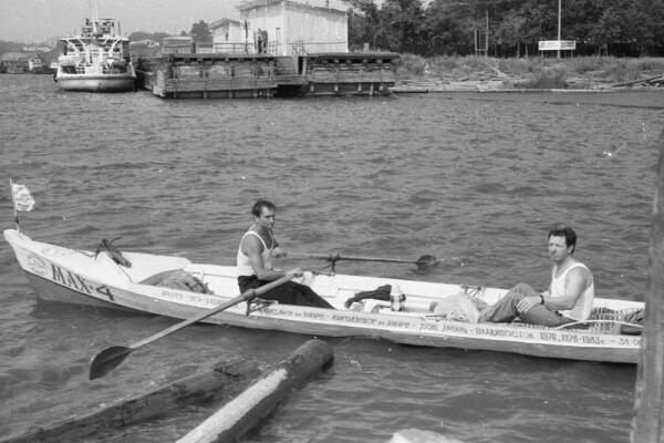 Стартовали Евгений Смургис и Валерий Лютиков 9 Июня 1967 года. В лодке оказалась и наша овчарка по кличке Ватан. По Каме, Волге, Дону догребли до Липецка. 4500 км прошли за 43 дня. Британцы гребли от Америки до Ирландии свои 2485 статутных миль (это 2485×1.609м=3998 км!) вдвое дольше — 91 день. Победа, правда, без соли и штормов!