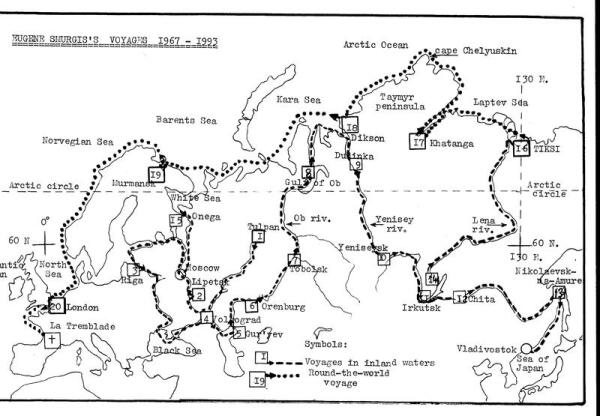 На переходе из Волгограда в устье Урала Евгений греб один. После его спутниками на разных этапах были Виктор Попов, Вячеслав Лыков и Николай Песляк — земляки из Липецка. Как всегда, самый трудный и опасный маршрут с выходом в Карское море пришлось идти в одиночку. Все шло гладко, и пограничники в устье Оби не чинили препятствий для выхода в Карское море. Вверх по Енисею нашелся спутник — Леонид Микула из Донецка. 2000 км за 30 дней и сломанные весла. Все же против течения могучей реки. В Иркутск по Ангаре, да еще и против течения, Евгений греб в одиночку.