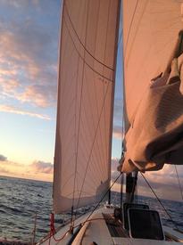 Средняя скорость — 6−7 узлов, что дает около 150 nm в сутки. Рекорд был — 179 nm. После захода солнца ветер крепчает, доходя до 35 узлов. Регулирую парусность только генуей, грот не трогаю. Лодка идет отлично, правда, на встречных волнах постоянно «БАА-БАХ», поэтому спать в носовой каюте страшно. Кажется, что сейчас нос отвалится. В кормовые каюты перейти не могу — они завалены комплектами гоночных парусов и прочим барахлом. Пришлось снять все двери в каюты — замки не держат и магниты, фиксирующие их в открытом состоянии, тоже.