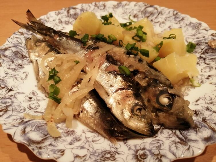 Ну, а лучшим гарниром к беломорке во все времена считалась отварная картошка. В этом и я отдаю дань традициям. А вот есть прямо из сковороды… Как-то мои домашние этот вариант не приветствуют. Поэтому выложил беломорку и картошку на порционные тарелки, полил картошку юшкой из сковороды, посыпал её рубленной зеленью…