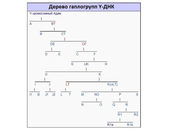 Разумеется, изучение наследования только по женской линии было бы неполным. Был открыт участок Y-хромосомы, передающейся по мужской линии. Остальное, в общем, аналогично истории с мтДНК, повторяться смысла нет. На рисунке показано дерево Y-групп. Так для России характерны представители гаплогрупп R1a1, N1c1, а у ирландцев больше представителей R1b1. Подробные карты желающие также могут найти в Интернете.