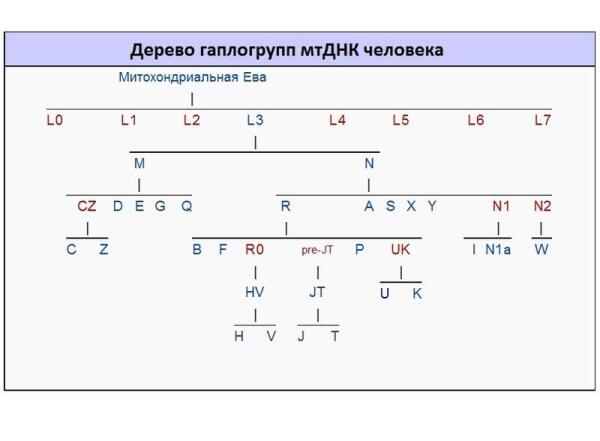 Впервые этот анализ был сделан как раз для островов Полинезии, т.к. количество жителей и вариантов расселения там значительно меньше. Естественно, для материков картина сложнее, но со временем и она была построена. Как видно на рисунке, различные вариации мтДНК представляют собой дерево, ведущее от прошлого к настоящему. Каждый «лист» дерева называется гаплогруппой. Так, например, в России часто встречаются люди групп H, K, R, U5 и пр. Группы далее дробятся на более мелкие: например, группа U делится на подгруппы U1-U8. В Сети можно найти географические карты миграции и распространения различных ареалов, что достаточно интересно.