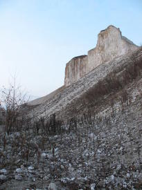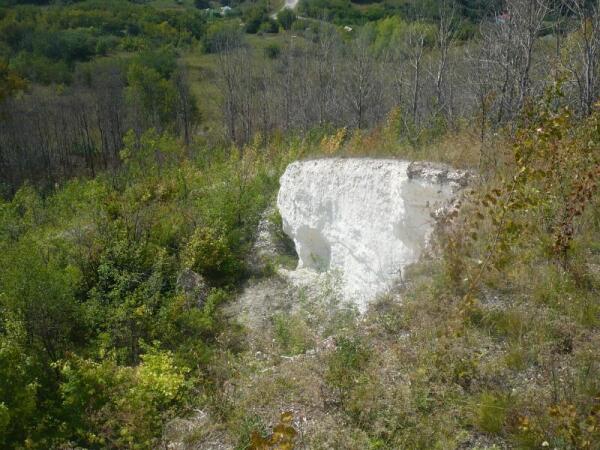 Что ж, машину придётся припарковать на обочине — наверх не проедет даже самый подготовленный внедорожник. Карабкаемся по меловой крошке, обходим пару расщелин на пути и с треском продираемся через сухие ветви, держа курс в направлении большого массивного мелового пласта, который видно ещё с асфальтовой дороги. Немного терпения — и мы у цели!