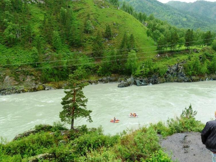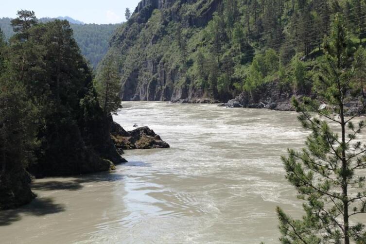 Широко известно неофициальное название Катуни — Бирюзовая. Она действительно ярко-бирюзового цвета, причем такой нарядной ее можно увидеть не только в осеннее время, как это следует из литературных источников, а и летом. Но в 2014 году, когда мы увидели Катунь, она несла мутную воду, грязно-серого цвета. Было ясно, что это последствия того катастрофического наводнения, которое недавно было на Алтае.