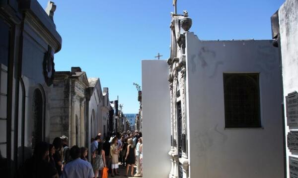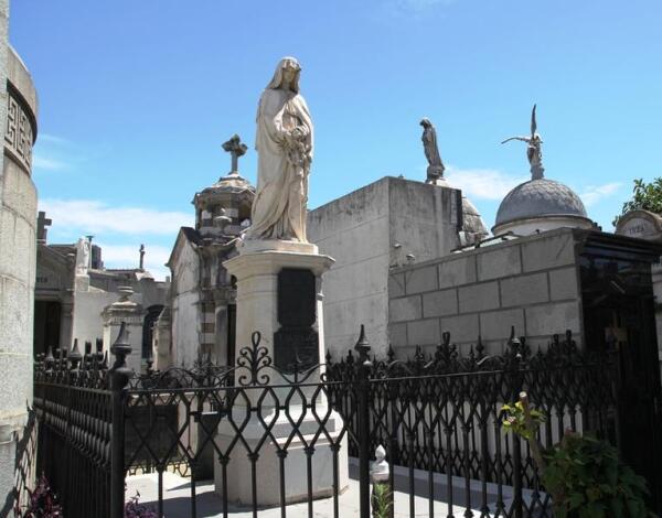 Именно таким кладбищем в Аргентине и является Реколета, и его посещение — цель многих туристов со всего света, ведь для них это не просто место захоронений, а скорее музей под открытым небом. Реколета — не кладбище в привычном для нас смысле, там не хоронят в землю. Шесть гектаров земли, на которых построен город мертвых внутри города живых, где в роскошных склепах, а их, ни много ни мало, а 6400 сооружений, нашли свой последний приют десятки тысяч граждан Аргентины, составляющих гордость страны. Перечень выдающихся людей занимает много страниц, достаточно сказать, что там покоится 25 президентов, 100 губернаторов и 200 героев войны за независимость. Например, Факундо Кироги, прозванный за неукротимый нрав «тигр сельвы», никогда не склонявший колени и по завещанию похороненный стоя. На надгробье помещена высеченная из каррарского мрамора фигура его безутешной жены.