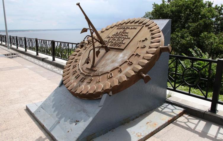 А рядом с балюстрадой, которая обрамляет верхний уровень площади и от которой открывается прекрасный вид на Волгу, находится скромный памятник в виде солнечных часов с надписью: «Взрослым и детям, убитым, замученным в плену, пропавшим без вести».