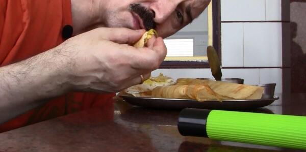 Перед возвращением мы решили зайти поесть, и наш гид посоветовал блюдо южно-индийской кухни «Масала доса», состоящее из большого хлебного «пузыря», как от чебурека, но внутри начинка из смеси вареного картофеля, жареного лука и специй. Есть надо было так: отламывали кусочек теста, им как ложкой зачерпывали начинку, макали в соус из кешью и кокосового молока и отправляли в рот. Очень вкусно!