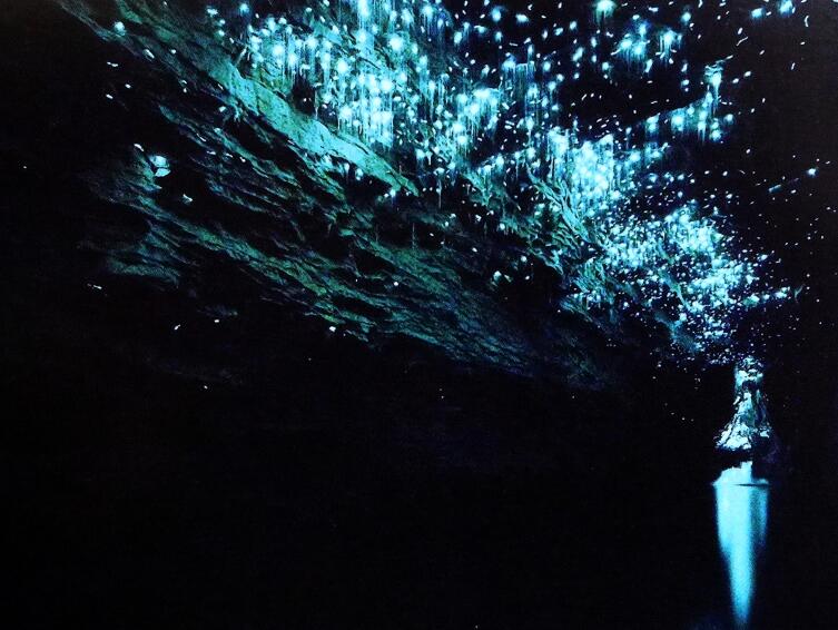 Именно в этом месте живут совершенно очаровательные и волшебные существа — светлячки Arachnocampa Luminosa. Их можно найти только на территории Новой Зеландии, и они отличаются необычным сине-зелёным свечением. Именно благодаря ему свод пещеры в темноте превращается в настоящее звёздное небо в морозную зимнюю ночь.