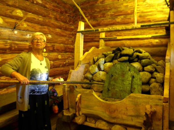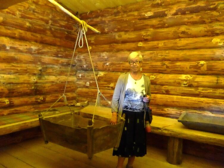 Но примыкающий к первому дому следующий, в два этажа, уже имеет небольшие окошки. В этом доме показан быт и хозяйство богатого крестьянина-ремесленника. Внутри несколько помещений, на первом этаже рабочие комнаты — здесь пряли, мотали льняные нитки, ткали, показаны прялка, поставец для лучины, моталка для ниток, ткацкий станок. На втором этаже размещались жилые помещения. Печь топилась по-черному, без трубы. Спали на полатях, они просторные. Окна маленькие, света там мало, поэтому снимки получились в желтом свете.