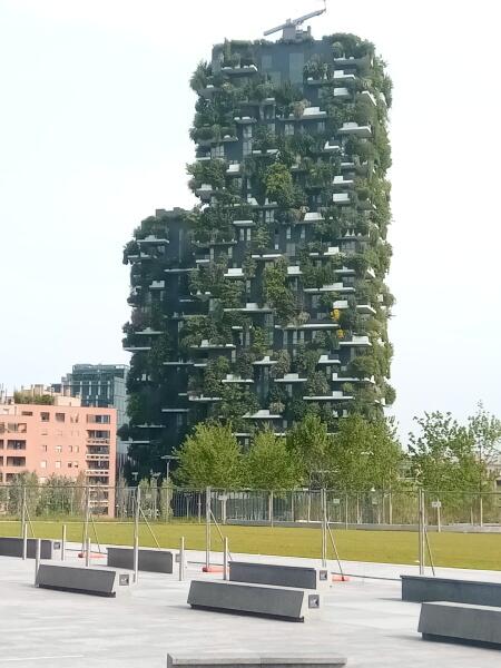 Рядом два уникальных высотных жилых здания, одно высотой 119 метров, а второе — 87 метров. Название этого комплекса «Bosco Verticale», что переводится на русский язык как «Вертикальный лес». Балконы здесь украшены разнообразными растениями, среди которых 800 полноценных деревьев. Подобного соединения жилых зданий и природы нет более нигде в мире. Озеленение небоскребов — чисто миланская фишка.