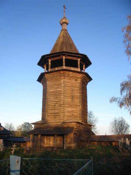Скрытая в срубе колокольни лестница ведет на площадку звона, огражденную по периметру резными столбиками, поддерживающими венчающий колокольню тесовый шатер с маленькой главкой.