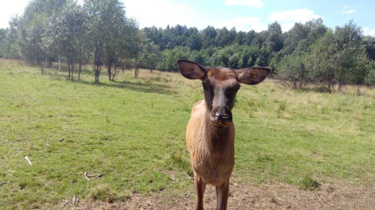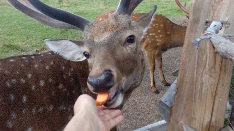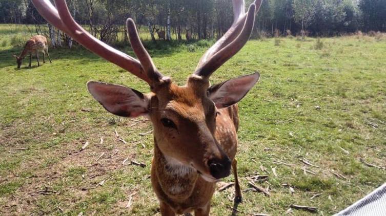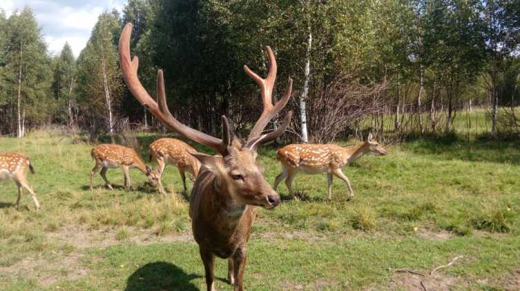 Захватив пакет нарезанной моркови с яблоками, я прибыл на место. Для начала пришлось немного потрястись в машинке сафари по пути к самим виновникам поездки. Во время езды лучше оглядываться по сторонам: за створками деревьев могут грациозно прятаться олени. Создаётся впечатление, сравнимое со встречей с диким животным где-нибудь на шоссе. По приезде же в безопасную зону рогатые сбегутся к вам всей толпой и начнется ваше общение с животными. Здесь будут игривые пятнистые олени и горделивые маралы.
