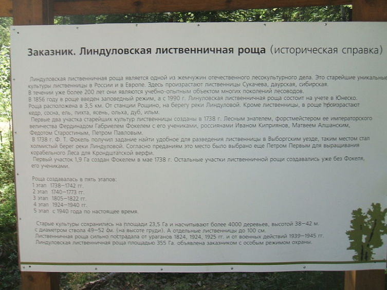Таким местом оказалась долина речки Линтуловки на Карельском перешейке. Рощу назвали Линдуловской, и вот уже почти 300 лет она является местом, где сначала производятся посадки семян лиственницы различных видов, а затем — надзор и уход за ростками, а потом и деревьями, выросшими из тех семян.