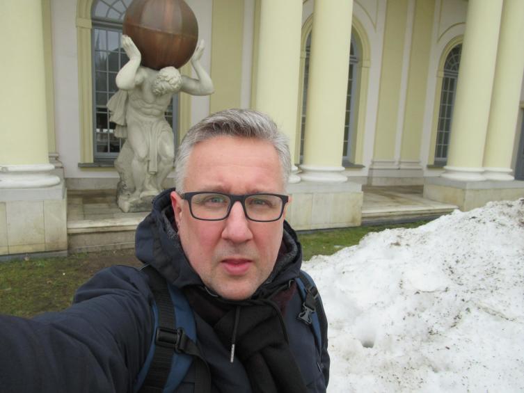 Мне даже повстречался знакомый уголок. Знакомый… из моего детства, что ли. Или из прежней жизни. Зеленая клумба — там действительно были живые зеленые листья в феврале, старая аллея (сказал бы «тенистая», если бы было лето) и какой-то спокойный, даже печальный, уголок… моего прошлого (здесь снова слеза по небритой щеке). Там же я пару раз сфоткался с несчастным атлантом (какой … придумал держать землю на плечах человеческих, пускай даже атлантов?!)
