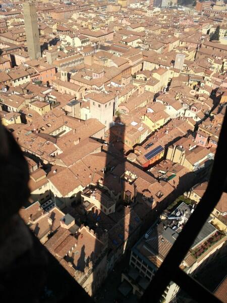 Две наклонившиеся друг к другу башни, стоящие рядом, — это впечатляет. Можно любоваться этой сладкой парочкой снизу. А еще можно забраться почти на 100-метровую высоту по лестнице — это тоже впечатляет. Сверху еще заметнее, что Болонья — большой город, старый город. И да — красный город.
