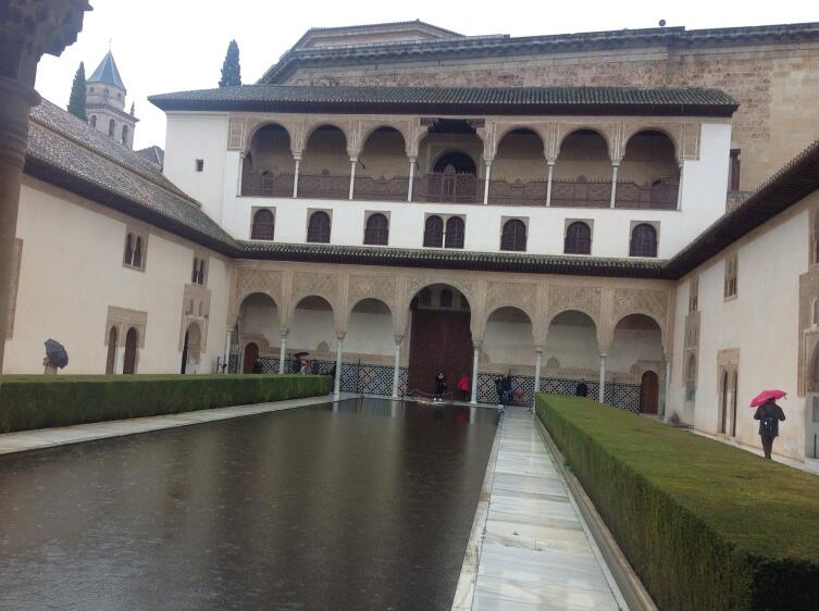 Следующий день должен был стать знаковым. Но знаковой оказалась и погода. Впервые за все время путешествия нас нагнал дождь, да не просто дождь, а холодный ливень. Автобус на Альгамбру останавливался прямо напротив нашего отеля, хотя и пешком туда можно было подняться минут за сорок. Наше время, как было указано в билете, было на 11 часов. Максимальное отклонение от точного времени предусматривалось до 20 минут, потом не попадешь.