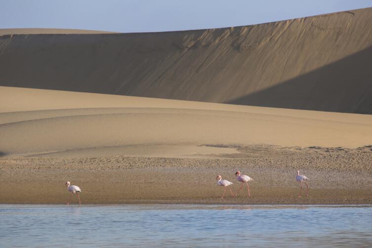 Пустыня в этих местах наступает на океан. Где-то медленнее, где-то быстрее. Дождей тут не бывает вообще. Зато каждую ночь бывают сильные туманы — и скудные местные растения обходятся той водой, что каждое раннее утро оседает на них в виде мелких капелек тумана. Тут есть даже жук Onymacris unguicularis. Он научился впитывать в себя влагу, которая оседает на его теле при конденсации тумана.