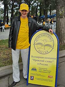 На фото - один из участников российской акции всемирной кампании "Проясняй слова!", которая состоялась 1 сентября 2007 года, в День знаний и День города Москвы. Фото из парка Горького.