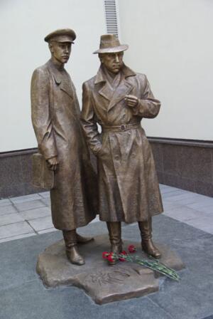Памятник «Место встречи изменить нельзя» знаменитым героям-сыщикам романа Аркадия и Георгия Вайнеров «Эра милосердия» Глебу Жеглову и Владимиру Шарапову возле здания МВД, в Киеве, 14 апреля 2009 г. Открытие памятника приурочено к 90-летию создания уголовного розыска органов внутренних дел. (Без «черной кошки» не обошлось.)