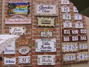 Слева или справа от входной парадной двери помещается художественное изделие (как правило, из керамики) с названием дома, атрибутикой и символикой, характеризующими этот дом и его владельцев. (АТРИБУТ, согласно словарю Даля, — отличительная принадлежность, присвоенный кому или чему знак, предмет для отличия; эмблема, ассоциирующаяся с каким-либо лицом). Фактически то же самое, что фамильный герб — наследственный отличительный знак.