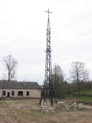 Как вы видите на фотографии копия Эйфелевой башни — 30 м (французский оригинал — 324 м) весьма приблизительная. Она является основанием для большого креста, который в ночное время может быть ярко освещен (возводила — компания «Глубокские электрические сети»). Инициатором проекта являлся настоятель костела в соседней деревне Мосар Йозас Булька. Париж входил до кончины Бульки в его католический приход. О Бульке на ШЖ имеется 2 статьи.