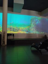 На первом этаже сразу как заходишь в большом затемнённом фойе расположены практически пляжные лежаки, одиночные и парные, возлежа на которых можно на огромном экране понаблюдать за морскими обитателями.