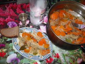 Вторая важнейшая составная часть, у меня на его приготовление ушло — 3 больших луковицы, нарезанных кольцами, 4 морковки (аналогично кольцами), пачка перца горошком и чайная ложка красного острого перца.