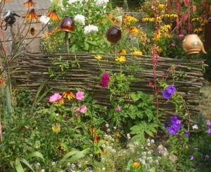 Не правда ли, получается довольно красиво? Не стоит плести декоративный плетень до самого верха, пусть концы колышков остаются свободными. Для полноты картины и придания плетню настоящего сельского вида, размещаем на кольях старые глиняные крынки и горшки или, если их нет, что-нибудь более современное, на ваше усмотрение.