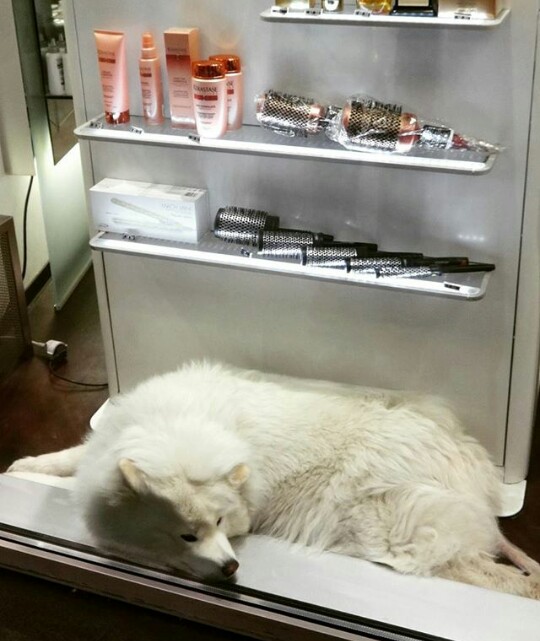 Собак можно часто увидеть в магазинах, как больших, так и маленьких, в парикмахерских и салонах красоты. Они растягиваются на полу и ждут своих хозяев.