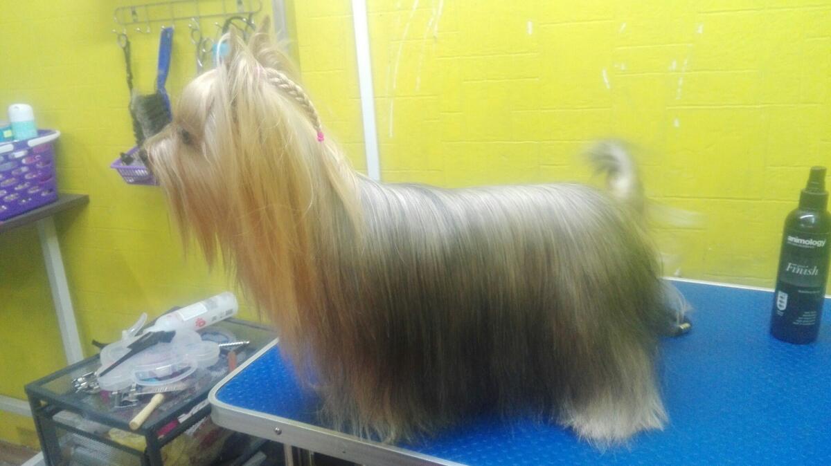 Собачку регулярно нужно мыть ухаживающим шампунем по типу шерсти, расчесывать, чтобы не образовались колтуны. Также уход за шерстью йорка, независимо от модели прически, может включать в себя бальзамы, ухаживающие масла. Для того чтобы шерсть лежала ровно и гладко, важно грамотно помыть собаку и высушить феном или компрессором.