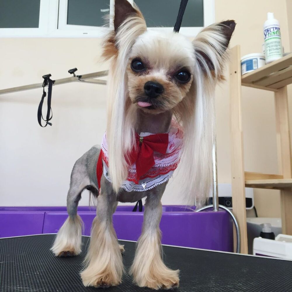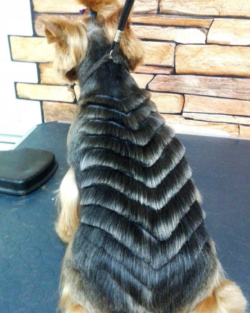 Креативные стрижки. Если оставить на корпусе йоркширского терьера шерсть длиной в 1−1,5 сантиметра, то можно сделать креативные стрижки «шиншилла» (она же «елочка»), «ананас». Также у мелких пород собак популярны блеск-тату с глиттером и выбривание узоров по трафаретам.