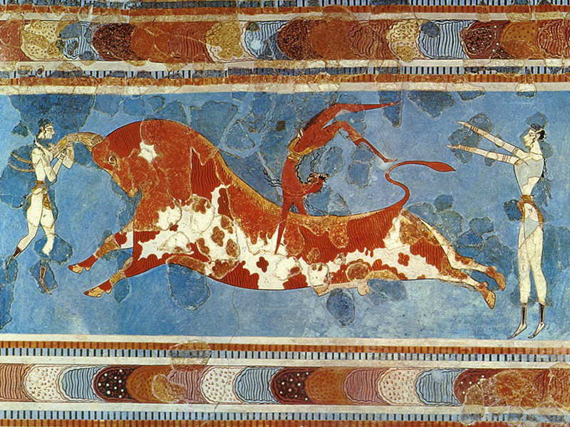 Настоящим же центром бычьего культа и тавромахии был Древний Крит. На фресках Кносского дворца можно увидеть, как стройные юноши разыгрывают с быками целые акробатические представления — хватают их за рога и совершают через спины животных настоящие кульбиты.